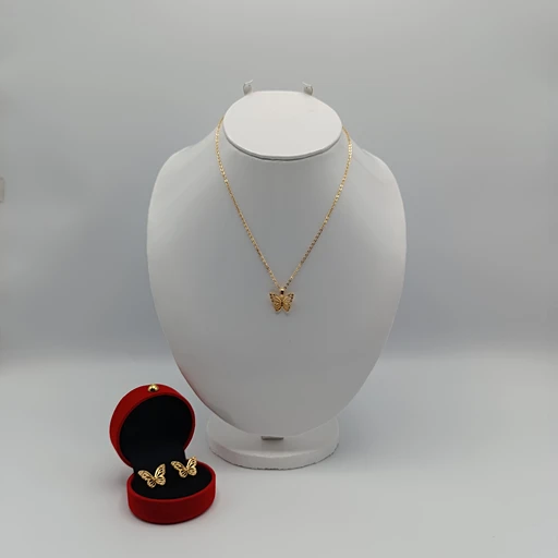 Elegant butterfly-themed necklace and stud earrings set in a radiant golden finish. Minimalist yet charming, perfect for everyday wear or gifting to nature-inspired jewelry lovers.